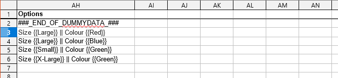 Both the names and values (for example, "Size" and "Large") must match up with options detailed in the second worksheet, the OptionGroup_Name and Option_Name respectively.